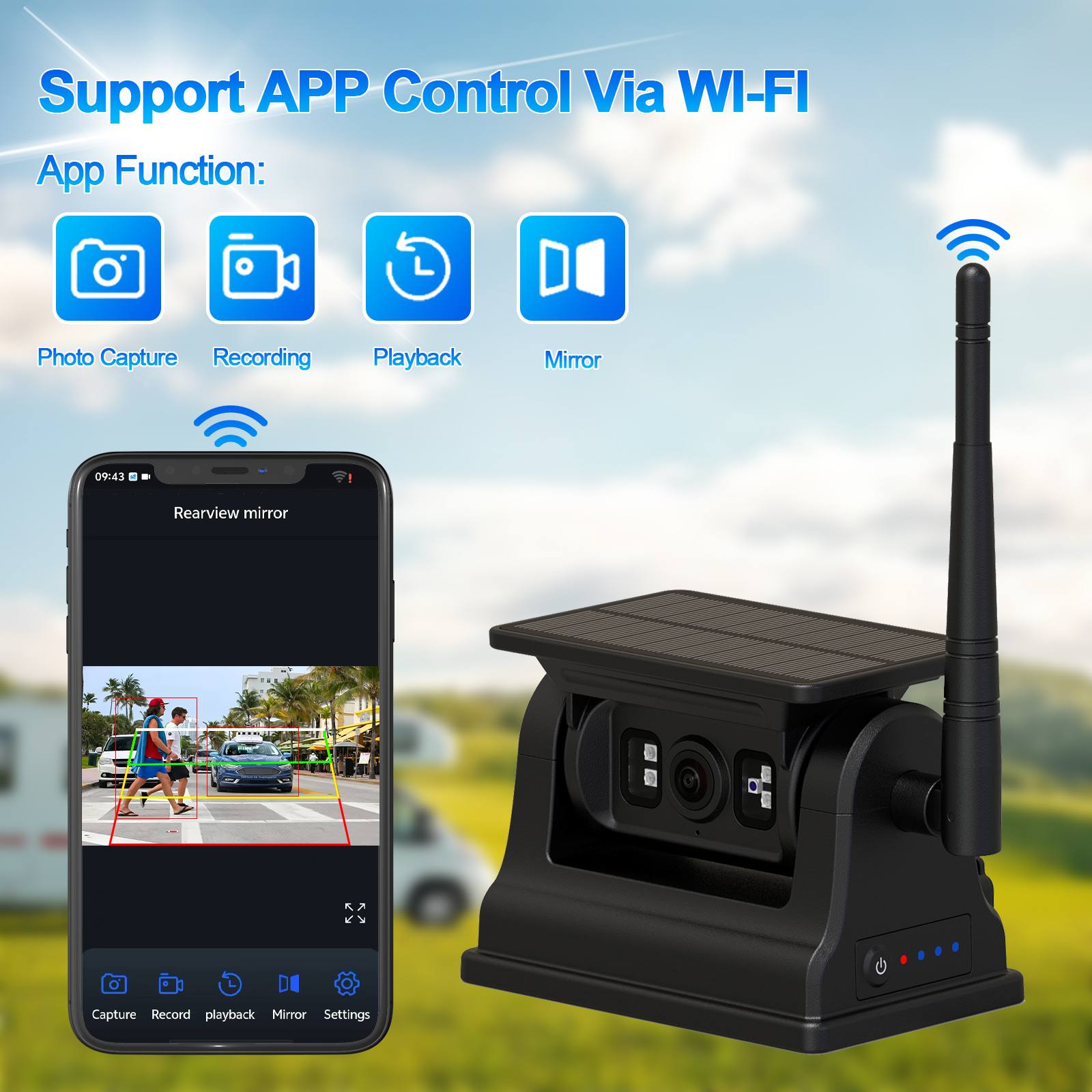 شاشة مركبة IPS 2AV AHD مقاس 9 بوصة تدعم الوسائط المتعددة CarPlayقائد السيارة كاميرا WIFI عكسية قابلة للشحن تعمل بالطاقة الشمسية تعمل بالذكاء الاصطناعي مع قاعدة مغناطيسية، لا تحتاج إلى أسلاك، سهلة التركيب بقاعدة مغناطيسية، كاميرا عكسية لاسلكية تعمل بالطاقة الشمسية مدمجة ببطارية قابلة لإعادة الشحن بسعة كبيرة 10500 مللي أمبير في الساعة ولها وظيفة رؤية ليلية، ويمكن أيضًا تشغيلها بالطاقة الشمسية وتوفير الطاقة وحماية البيئة. تدعم الكاميرا وظيفة الكشف عن الذكاء الاصطناعي، ويمكنها اكتشاف المشاة والمركبات أيضًايدعم الاتصال بالهاتف المحمول عبر WIFI، ويسمح للمستخدم بالتقاط الصور وتسجيل الفيديو وتشغيله، وكذلك ضبط معايرة الذكاء الاصطناعي، وما إلى ذلك. هذه الكاميرا هي خيارك الأفضل لمعدات مراقبة أمن المركبات لقيادة سيارتك بأمان.