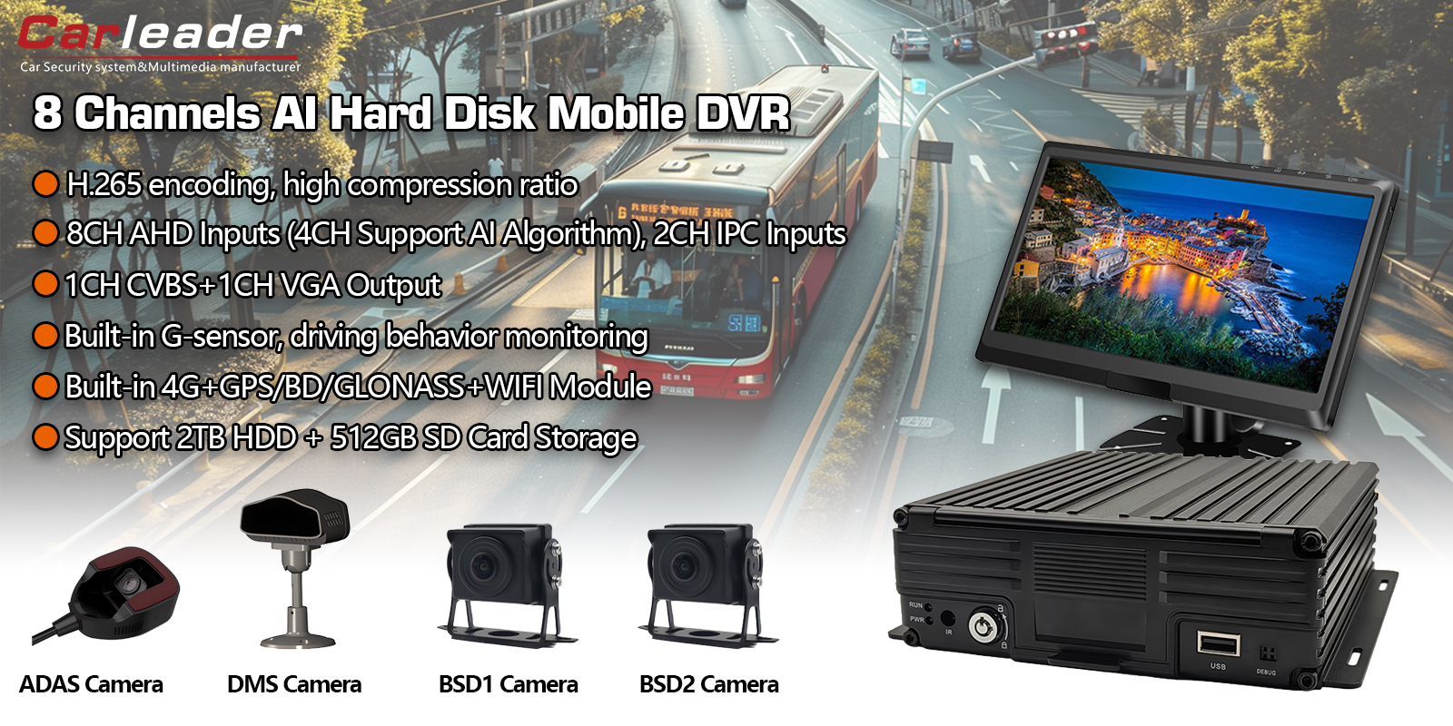 قائد السيارة8CH AI HDD Mobile DVR يدعم ADAS+DMS+BSDهو الحل الأمثل للأساطيل التجارية والنقل العام والخدمات اللوجستية والمركبات الخاصة التي تتطلب:
