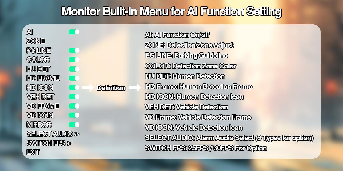 قائد السيارةنظام مراقبة كشف النقاط العمياء AI BSD مقاس 7 بوصات يدعم معايرة الذكاء الاصطناعي، حل كاميرا مدعوم بالذكاء الاصطناعي يدعم الكشف عن المشاة، والكشف عن المركبات، ويزيد بشكل كبير من السلامة أثناء القيادة، والمراقبة بقائمة معايرة الذكاء الاصطناعي المدمجة، ويسمح للمستخدم بضبط منطقة الكشف، وتشغيل/إيقاف عرض ألوان منطقة الكشف، ونوع صوت التنبيه، وعرض أيقونة السيارة والمشاة، واختيار كائن الكشف، وما إلى ذلك.