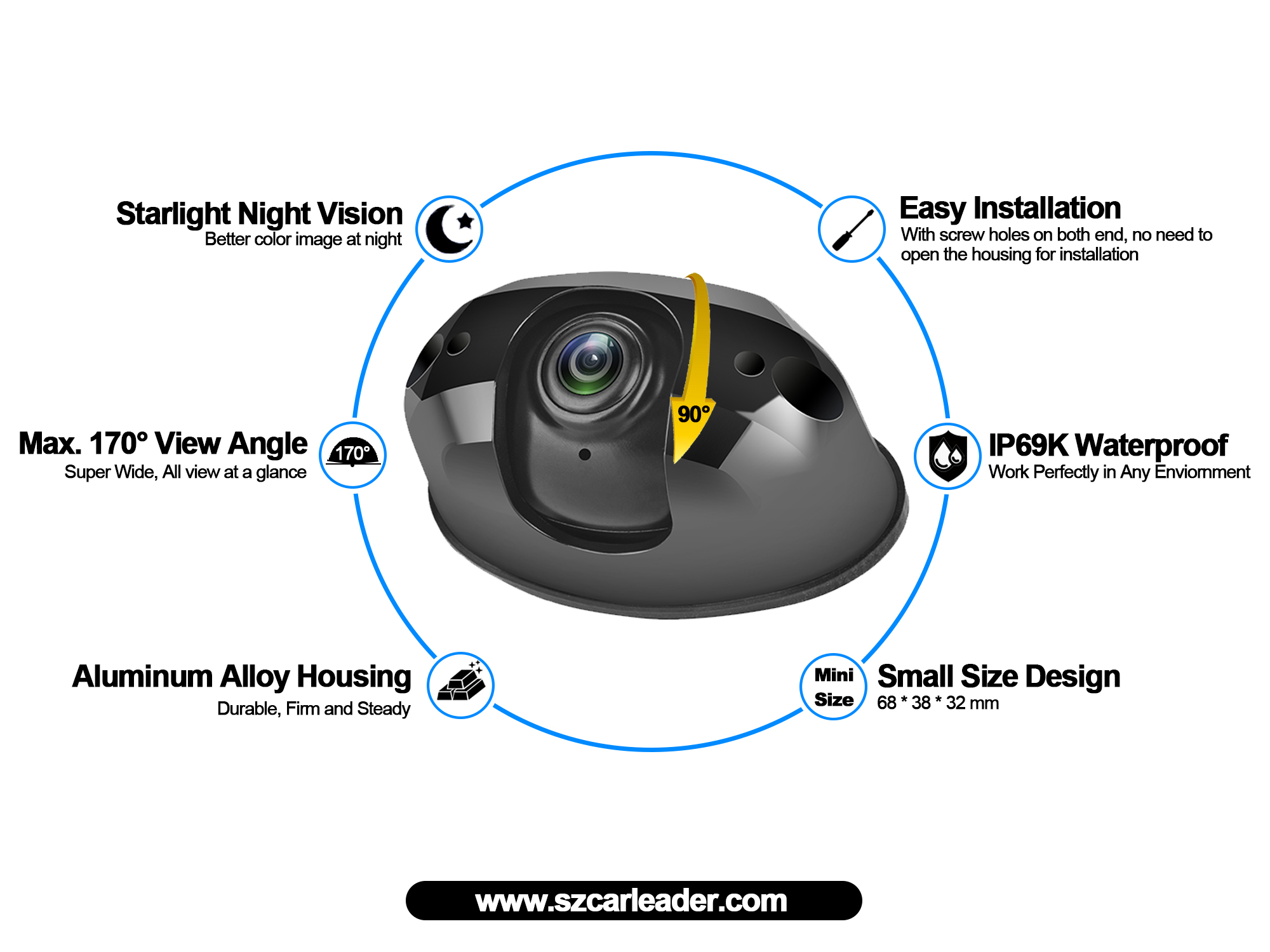 توفر الكاميرا الاحتياطية المقاومة للماء بزاوية رؤية واسعة AHD 170 درجة للسائق صورة واضحة في الوقت الحقيقي أثناء عملية القيادة. زاوية كبيرة للغاية تصل إلى 170 درجة، مما يوفر للسائق نطاقًا واسعًا من نطاق المراقبة، حتى يتمكن السائق من مراقبة البيئة المحيطة بالسيارة دون أي نقاط عمياء