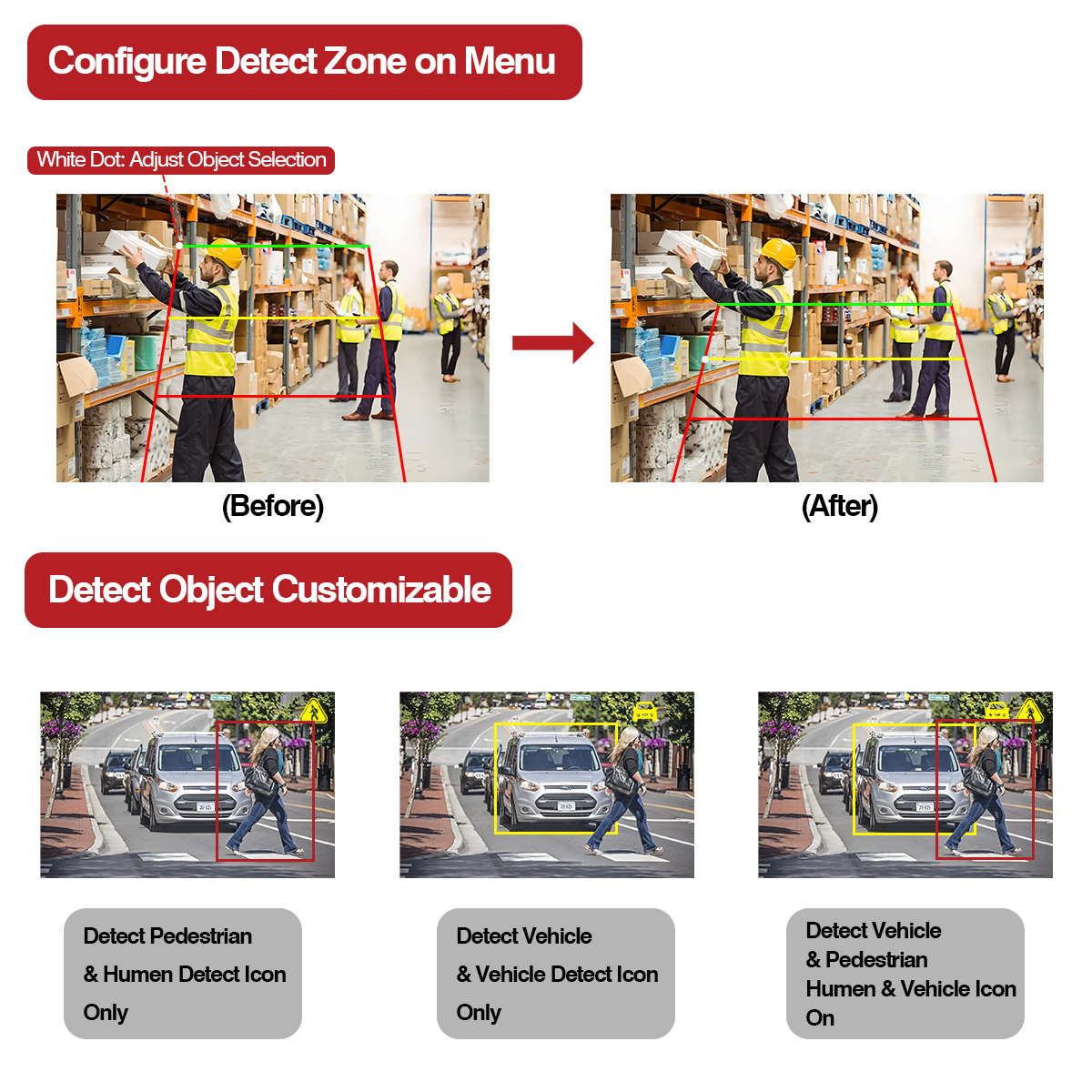 كاميرا الذكاء الاصطناعي هذه مع وظيفة ضوء تحذير مدمجة، سيتغير لون الضوء إلى اللون المقابل عندما يدخل كائن الكشف إلى منطقة اكتشاف مختلفة (أحمر، أصفر، أخضر). تتكامل أيضًا مع التنبيه لتنبيه المشاة والمركبة المحيطة الذين يقتربون من سيارتك.