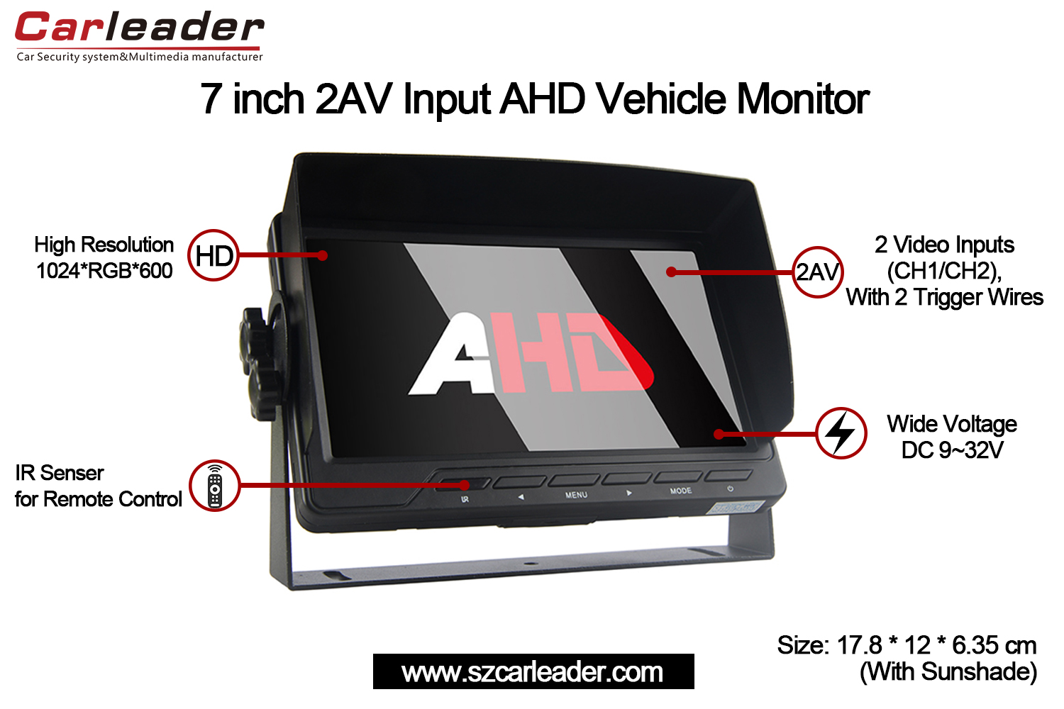 شاشة السيارة Carleader 7 بوصة AHD 2CH مدخل السيارةيجمع بين الموثوقية والوضوح وتعدد الاستخدامات في تصميم مدمج ومتين، مما يجعله خيارًا ممتازًا لاحتياجات مراقبة المركبات المهنية والشخصية.
